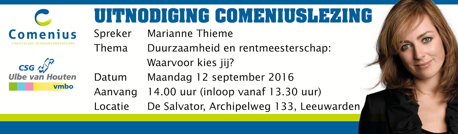 Marianne Thieme is gevraagd de Comenius-lezing 2016 te verzorgen op een geheel eigentijdse en prikkelende wijze. Het thema is: ‘Waarvoor kies jij?’. Thieme is een spraakmakende politica en een veel gevraagd spreekster.